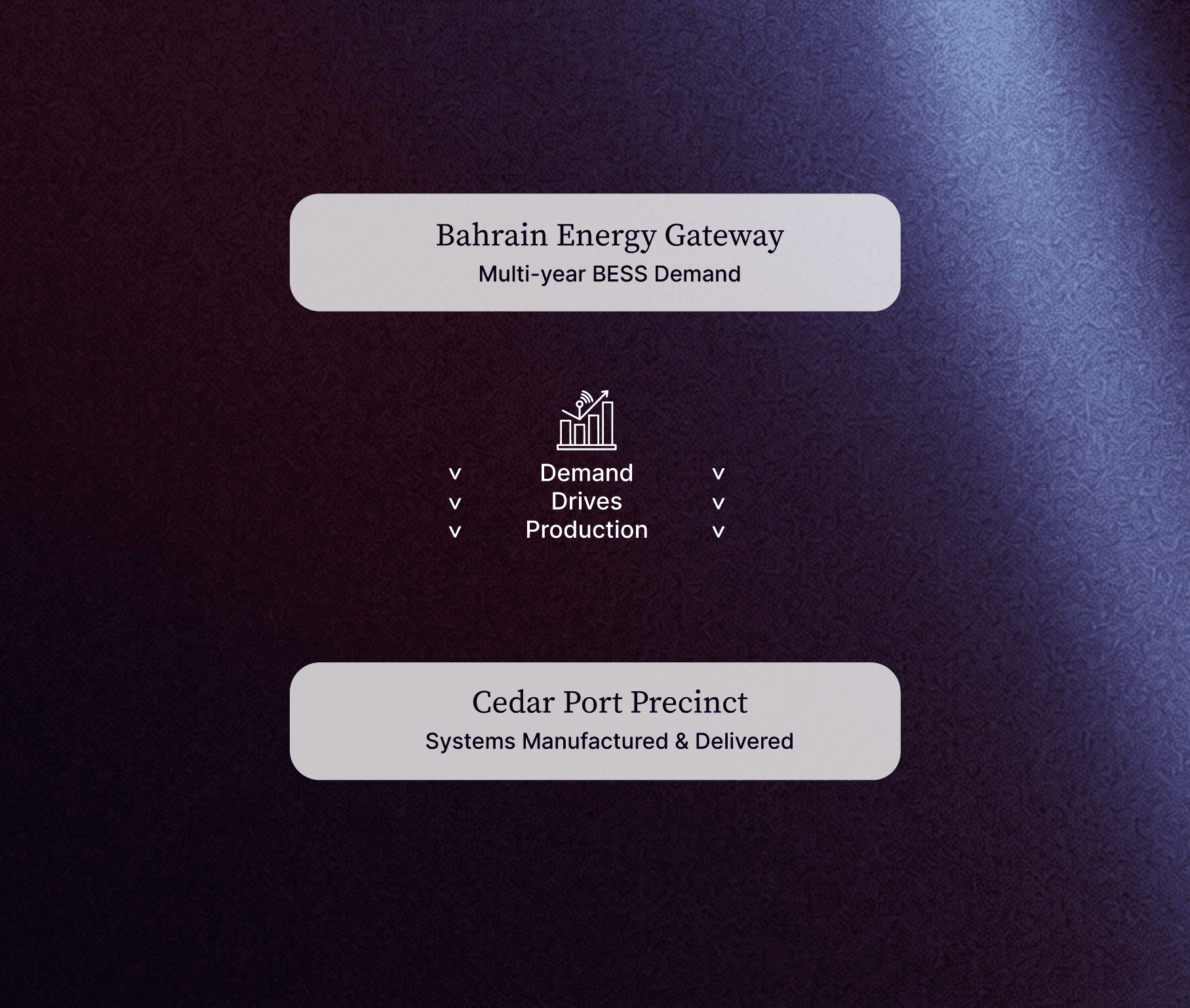 The Bahrain Energy Gateway creates multi-year, repeatable demand for battery energy storage systems - measured in gigawatt-hours and structured through long-term revenue frameworks. Cedar Port manufactures those systems. Production planning, supply chain investment, and capital deployment are all informed by demand that is defined, contracted, and durable.