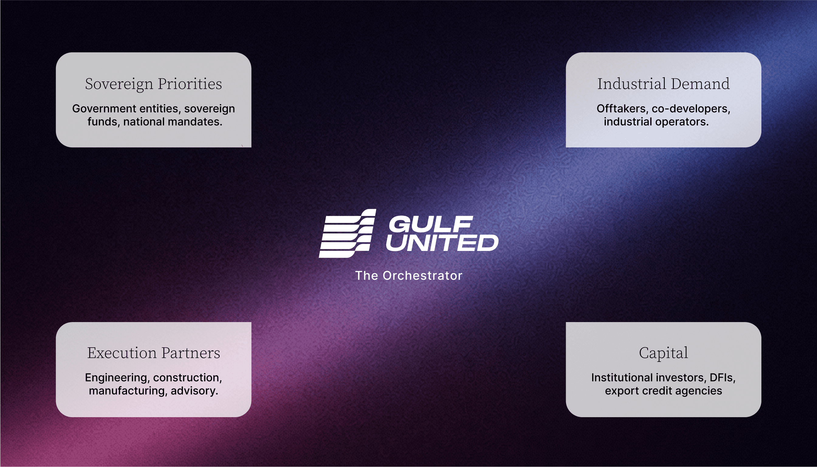 Gulf United sits at the intersection of four forces: sovereign priorities, industrial demand, capital, and execution capability. It is the structuring layer that aligns them into coordinated, financeable outcomes.